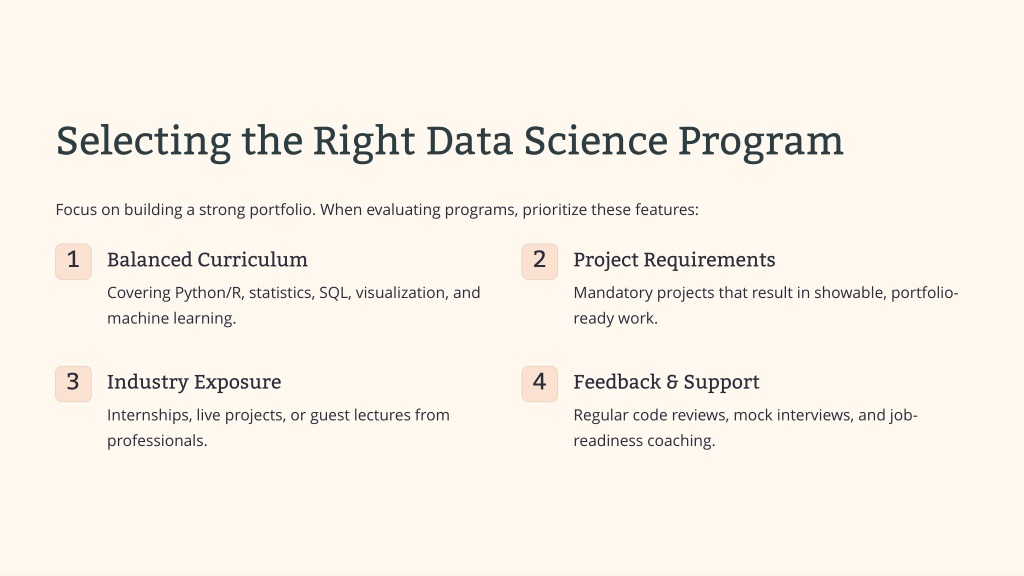 Selecting the Right Data Science Program Focus on building a strong portfolio. When evaluating programs, prioritize these features: Balanced Curriculum Project Requirements 1 2 Covering Python/R, statistics, SQL, visualization, and machine learning. Mandatory projects that result in showable, portfolio-ready work. Industry Exposure Feedback & Support 3 4 Internships, live projects, or guest lectures from professionals. Regular code reviews, mock interviews, and job-readiness coaching.