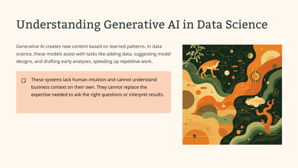 2. Understanding Generative AI in Data Science Generative AI creates new content based on learned patterns. In data science, these models assist with tasks like adding data, suggesting model designs, and drafting early analyses, speeding up repetitive work. These systems lack human intuition and cannot understand business context on their own. They cannot replace the expertise needed to ask the right questions or interpret results.