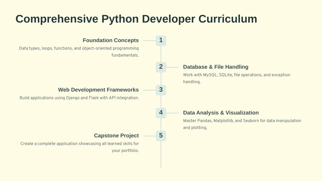 Comprehensive Python Developer Curriculum Foundation Concepts 1 Data types, loops, functions, and object-oriented programming fundamentals. Database & File Handling 2 Work with MySQL, SQLite, file operations, and exception handling. Web Development Frameworks 3 Build applications using Django and Flask with API integration. Data Analysis & Visualization 4 Master Pandas, Matplotlib, and Seaborn for data manipulation and plotting. Capstone Project 5 Create a complete application showcasing all learned skills for your portfolio.