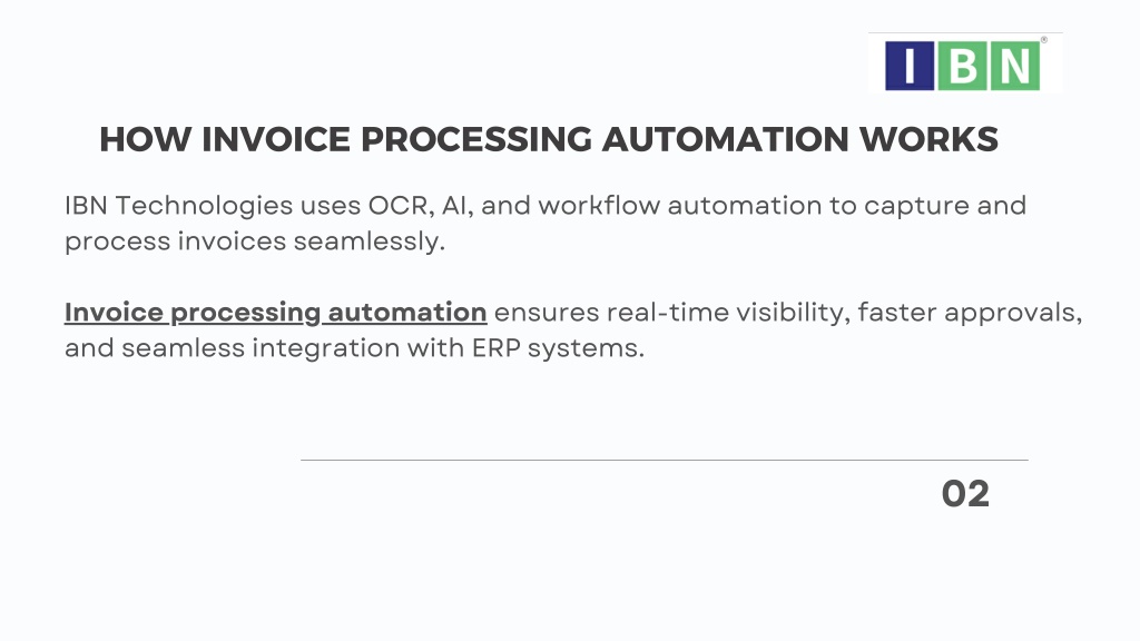 3. HOW INVOICE PROCESSING AUTOMATION WORKS IBN Technologies uses OCR, AI, and workflow automation to capture and process invoices seamlessly. Invoice processing automation ensures real-time visibility, faster approvals, and seamless integration with ERP systems. 02