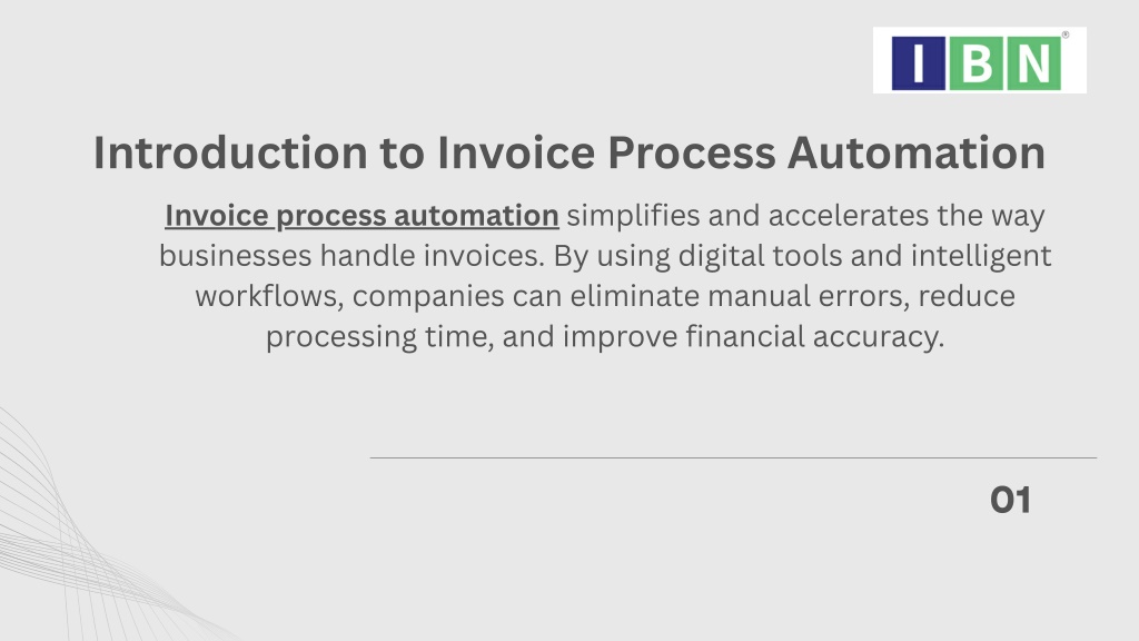 Introduction to Invoice Process Automation Invoice process automation simplifies and accelerates the way businesses handle invoices. By using digital tools and intelligent workflows, companies can eliminate manual errors, reduce processing time, and improve financial accuracy. 01