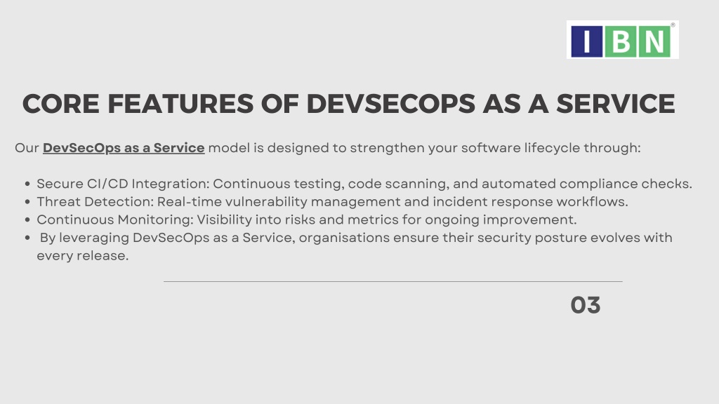CORE FEATURES OF DEVSECOPS AS A SERVICE Our DevSecOps as a Service model is designed to strengthen your software lifecycle through: Secure CI/CD Integration: Continuous testing, code scanning, and automated compliance checks. Threat Detection: Real-time vulnerability management and incident response workflows. Continuous Monitoring: Visibility into risks and metrics for ongoing improvement. By leveraging DevSecOps as a Service, organisations ensure their security posture evolves with every release. 03
