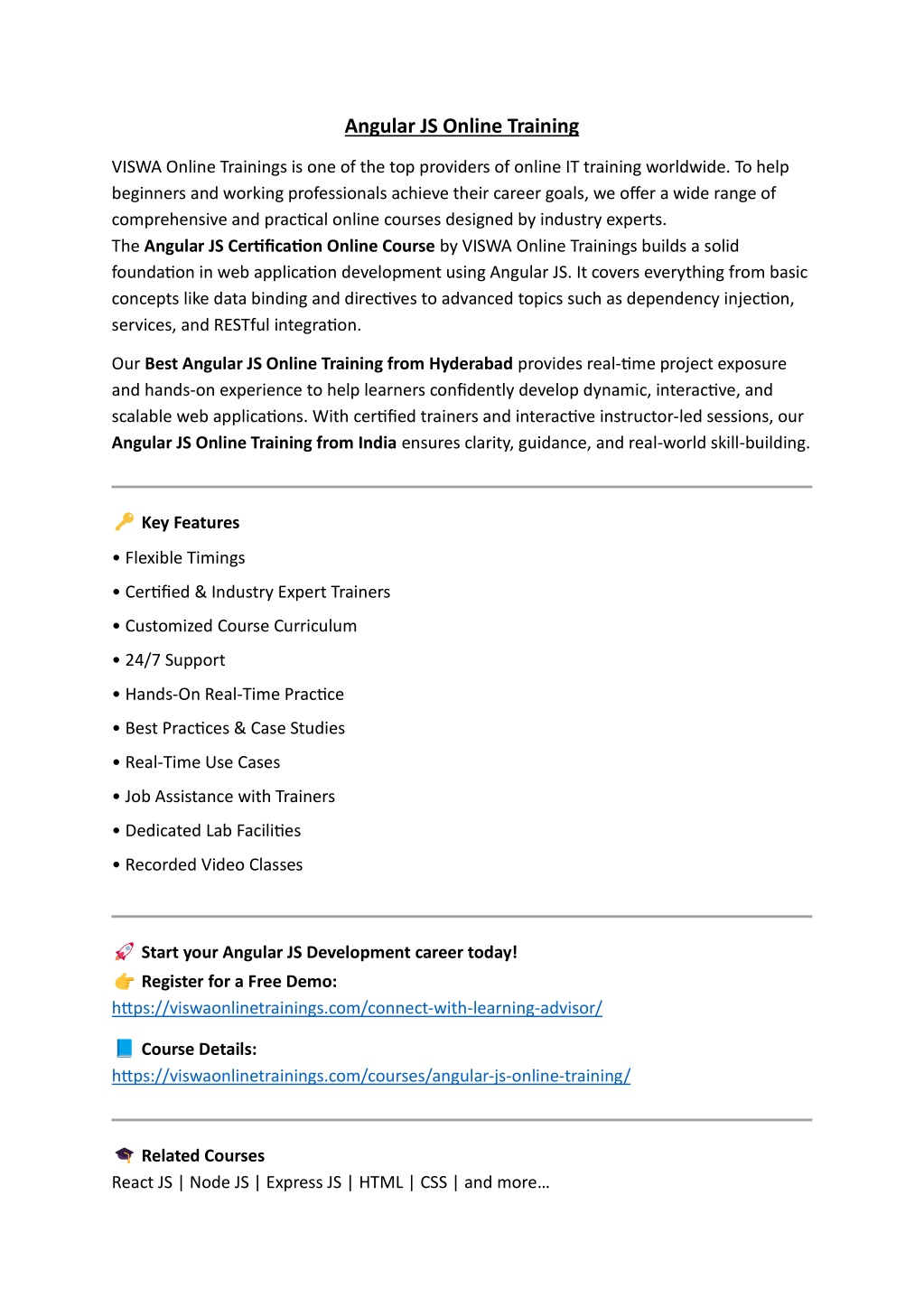 Contact Us VISWA Online Trainings India: +91 9493999586 Email: viswaonlinetrainings@gmail.com Website: https://viswaonlinetrainings.com SEO Meta Details Meta Title: Angular JS Online Training | Best Angular JS Course from Hyderabad – VISWA Online Trainings Meta Description: Join VISWA Online Trainings for the Best Angular JS Online Training from Hyderabad. Learn Angular JS with live projects, certified trainers & job support. Keywords: Angular JS Online Training, Learn Angular JS Online, Angular JS Course in Hyderabad, Best Angular JS Certification Course, VISWA Online Trainings Google Ads Description (with Keywords) Learn Angular JS Online Training from certified experts. Best Angular JS Course from Hyderabad with real-time projects & job assistance. Enroll today!