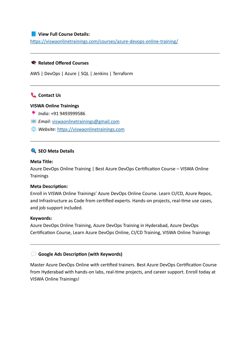 View Full Course Details: https://viswaonlinetrainings.com/courses/azure-devops-online-training/ Related Offered Courses AWS | DevOps | Azure | SQL | Jenkins | Terraform Contact Us VISWA Online Trainings India: +91 9493999586 Email: viswaonlinetrainings@gmail.com Website: https://viswaonlinetrainings.com SEO Meta Details Meta Title: Azure DevOps Online Training | Best Azure DevOps Certification Course – VISWA Online Trainings Meta Description: Enroll in VISWA Online Trainings’ Azure DevOps Online Course. Learn CI/CD, Azure Repos, and Infrastructure as Code from certified experts. Hands-on projects, real-time use cases, and job support included. Keywords: Azure DevOps Online Training, Azure DevOps Training in Hyderabad, Azure DevOps Certification Course, Learn Azure DevOps Online, CI/CD Training, VISWA Online Trainings Google Ads Description (with Keywords) Master Azure DevOps Online with certified trainers. Best Azure DevOps Certification Course from Hyderabad with hands-on labs, real-time projects, and career support. Enroll today at VISWA Online Trainings!