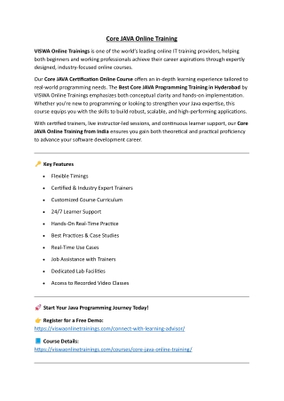 Core JAVA Online Training VISWA Online Trainings is one of the world’s leading online IT training providers, helping both beginners and working professionals achieve their career aspirations through expertly designed, industry-focused online courses. Our Core JAVA Certification Online Course offers an in-depth learning experience tailored to real-world programming needs. The Best Core JAVA Programming Training in Hyderabad by VISWA Online Trainings emphasizes both conceptual clarity and hands-on implementation. Whether you’re new to programming or looking to strengthen your Java expertise, this course equips you with the skills to build robust, scalable, and high-performing applications. With certified trainers, live instructor-led sessions, and continuous learner support, our Core JAVA Online Training from India ensures you gain both theoretical and practical proficiency to advance your software development career. Key Features •Flexible Timings •Certified & Industry Expert Trainers •Customized Course Curriculum •24/7 Learner Support •Hands-On Real-Time Practice •Best Practices & Case Studies •Real-Time Use Cases •Job Assistance with Trainers •Dedicated Lab Facilities •Access to Recorded Video Classes Start Your Java Programming Journey Today! Register for a Free Demo: https://viswaonlinetrainings.com/connect-with-learning-advisor/ Course Details: https://viswaonlinetrainings.com/courses/core-java-online-training/