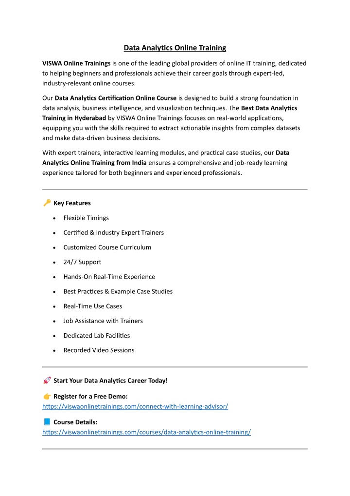 Data Analytics Online Training VISWA Online Trainings is one of the leading global providers of online IT training, dedicated to helping beginners and professionals achieve their career goals through expert-led, industry-relevant online courses. Our Data Analytics Certification Online Course is designed to build a strong foundation in data analysis, business intelligence, and visualization techniques. The Best Data Analytics Training in Hyderabad by VISWA Online Trainings focuses on real-world applications, equipping you with the skills required to extract actionable insights from complex datasets and make data-driven business decisions. With expert trainers, interactive learning modules, and practical case studies, our Data Analytics Online Training from India ensures a comprehensive and job-ready learning experience tailored for both beginners and experienced professionals. Key Features •Flexible Timings •Certified & Industry Expert Trainers •Customized Course Curriculum •24/7 Support •Hands-On Real-Time Experience •Best Practices & Example Case Studies •Real-Time Use Cases •Job Assistance with Trainers •Dedicated Lab Facilities •Recorded Video Sessions Start Your Data Analytics Career Today! Register for a Free Demo: https://viswaonlinetrainings.com/connect-with-learning-advisor/ Course Details: https://viswaonlinetrainings.com/courses/data-analytics-online-training/