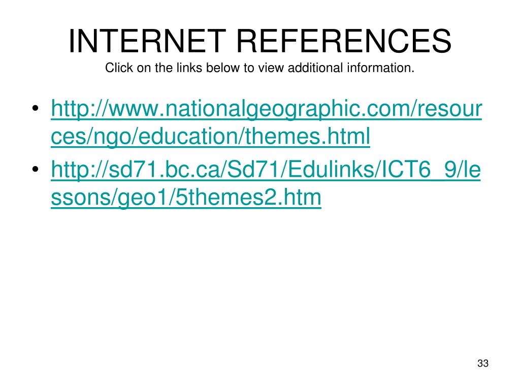 INTERNET REFERENCESClick on the links below to view additional information. • http://www.nationalgeographic.com/resources/ngo/education/themes.html • http://sd71.bc.ca/Sd71/Edulinks/ICT6_9/lessons/geo1/5themes2.htm
