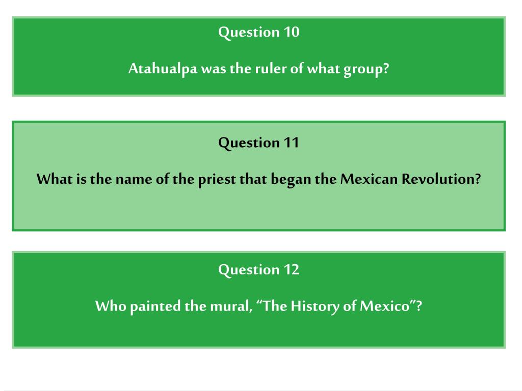 Question 10 Atahualpa was the ruler of what group? Question 11 What is the name of the priest that began the Mexican Revolution? Question 12 Who painted the mural, “The History of Mexico”?
