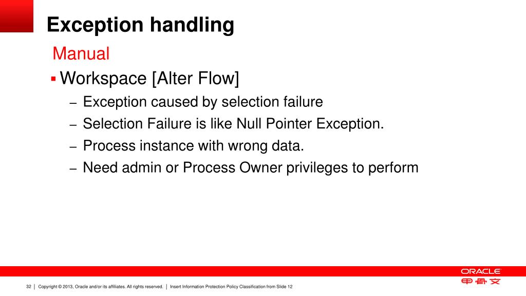 Exception handling • Workspace [Alter Flow] • Exception caused by selection failure • Selection Failure is like Null Pointer Exception. • Process instance with wrong data. • Need admin or Process Owner privileges to perform • Manual