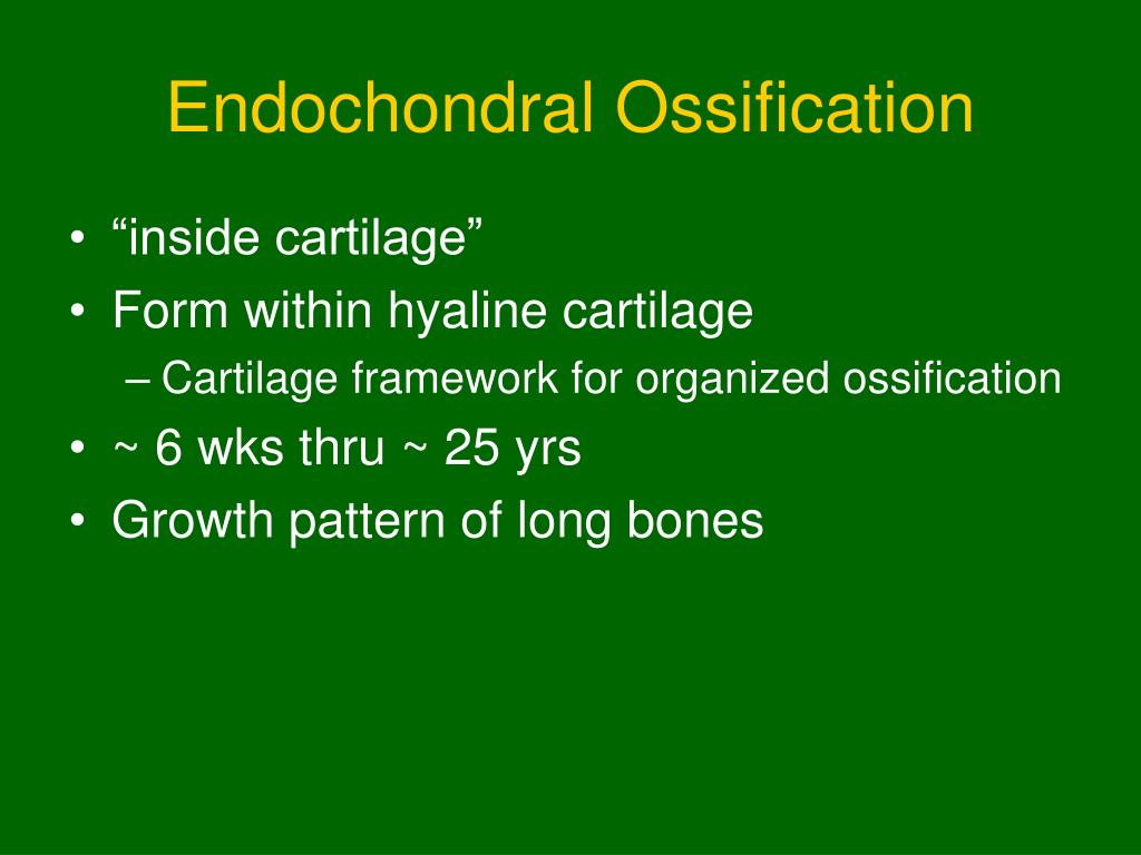 Endochondral Ossification • “inside cartilage” • Form within hyaline cartilage • Cartilage framework for organized ossification • ~ 6 wks thru ~ 25 yrs • Growth pattern of long bones