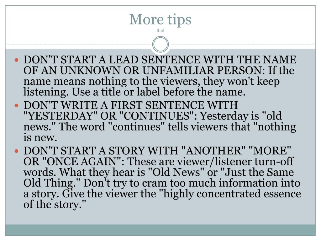 More tipsIbid DON'T START A LEAD SENTENCE WITH THE NAME OF AN UNKNOWN OR UNFAMILIAR PERSON: If the name means nothing to the viewers, they won't keep listening. Use a title or label before the name. DON'T WRITE A FIRST SENTENCE WITH "YESTERDAY" OR "CONTINUES": Yesterday is "old news." The word "continues" tells viewers that "nothing is new. DON'T START A STORY WITH "ANOTHER" "MORE" OR "ONCE AGAIN": These are viewer/listener turn-off words. What they hear is "Old News" or "Just the Same Old Thing." Don't try to cram too much information into a story. Give the viewer the "highly concentrated essence of the story."