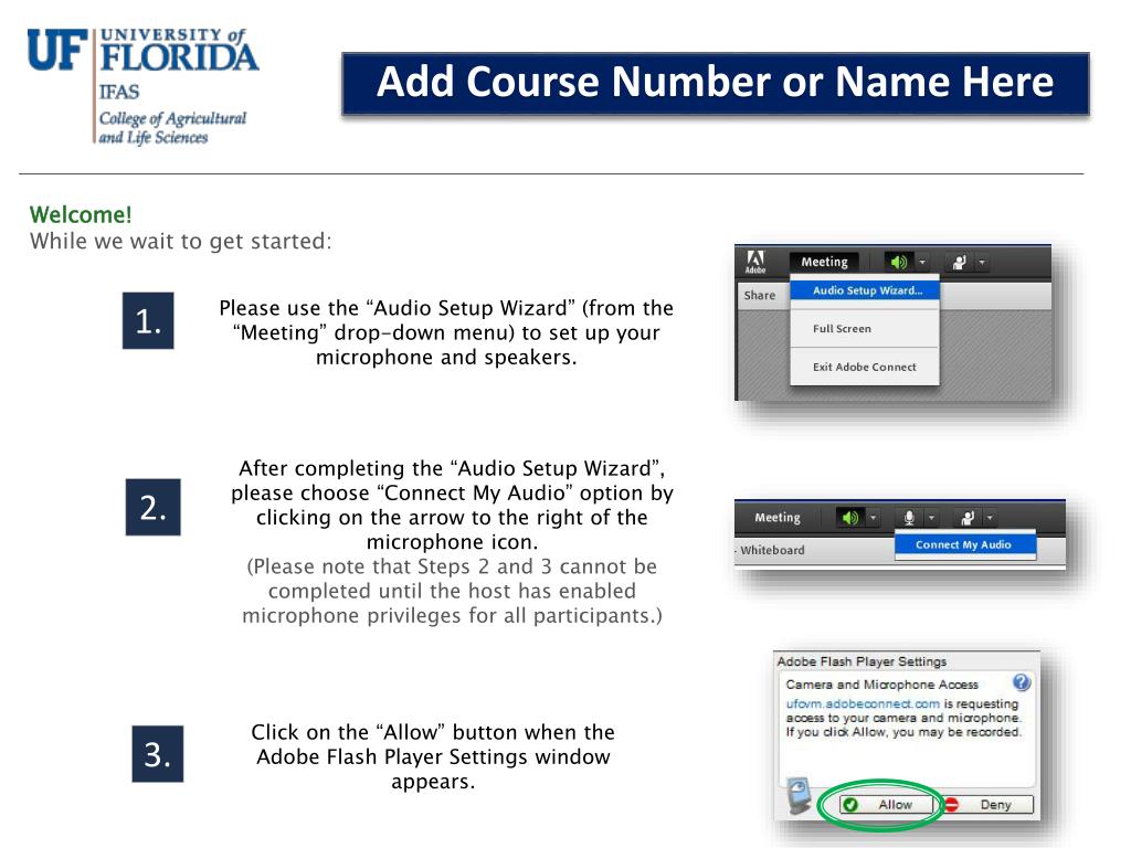 Welcome!While we wait to get started: Add Course Number or Name Here 1. Please use the “Audio Setup Wizard” (from the “Meeting” drop-down menu) to set up your microphone and speakers. After completing the “Audio Setup Wizard”, please choose “Connect My Audio” option by clicking on the arrow to the right of the microphone icon.(Please note that Steps 2 and 3 cannot be completed until the host has enabled microphone privileges for all participants.) 2. Click on the “Allow” button when the Adobe Flash Player Settings window appears. 3.