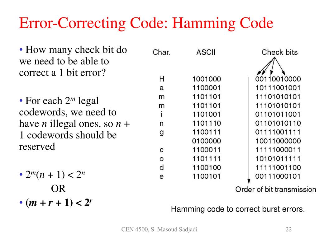 How many check bit do we need to be able to correct a 1 bit error? For each 2m legal codewords, we need to have n illegal ones, so n + 1 codewords should be reserved 2m(n + 1) < 2n OR (m + r + 1) < 2r Error-Correcting Code: Hamming Code Hamming code to correct burst errors. CEN 4500, S. Masoud Sadjadi