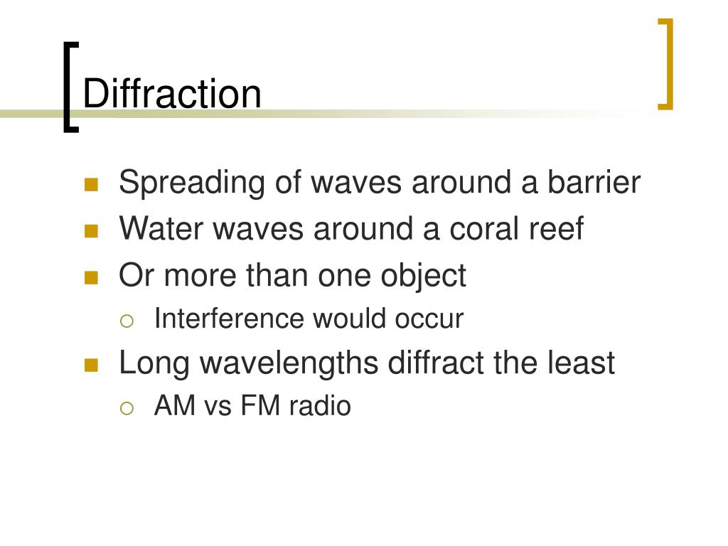 Diffraction • Spreading of waves around a barrier • Water waves around a coral reef • Or more than one object • Interference would occur • Long wavelengths diffract the least • AM vs FM radio