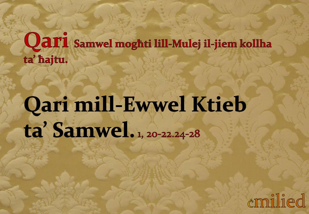 Qari Samwel mogħti lill-Mulej il-jiem kollha ta’ ħajtu. Qari mill-Ewwel Ktieb ta’ Samwel.1, 20-22.24-28 Ċmilied
