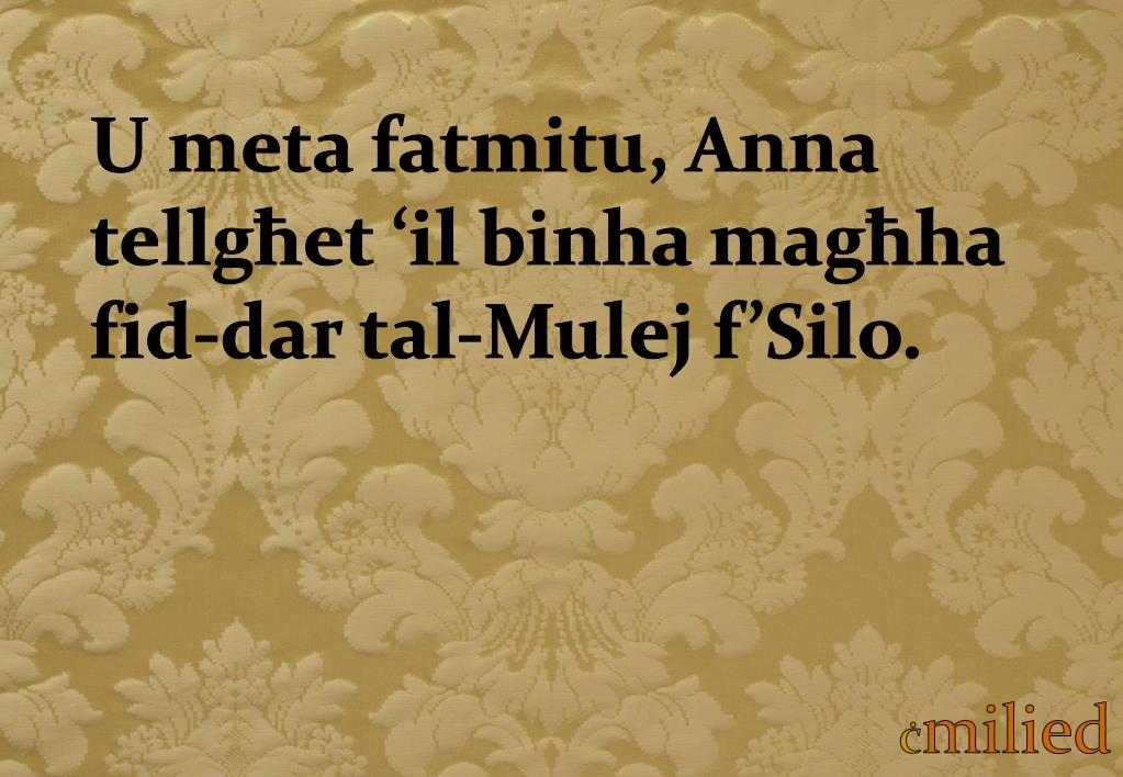 Imma Anna ma telgħetx, għaliex qalet lil żewġha: «Meta nkun ftamt it-tifel, Ċmilied