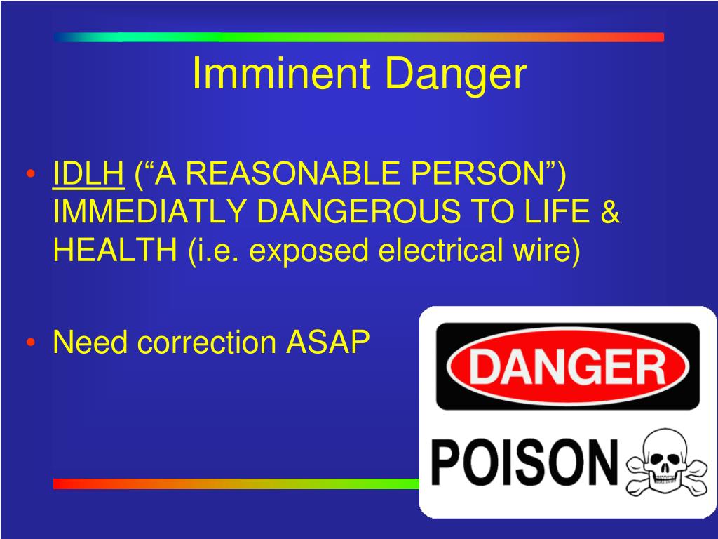 Imminent Danger • IDLH (“A REASONABLE PERSON”) IMMEDIATLY DANGEROUS TO LIFE & HEALTH (i.e. exposed electrical wire) • Need correction ASAP