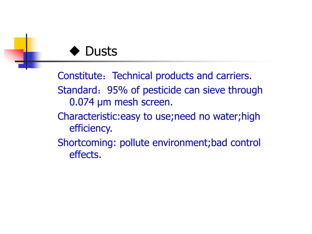 ◆ Dusts Constitute:Technical products and carriers. Standard:95% of pesticide can sieve through 0.074 µm mesh screen. Characteristic:easy to use;need no water;high efficiency. Shortcoming: pollute environment;bad control effects.