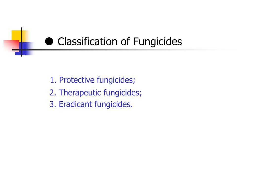 ● Classification of Fungicides 1. Protective fungicides; 2. Therapeutic fungicides; 3. Eradicant fungicides.
