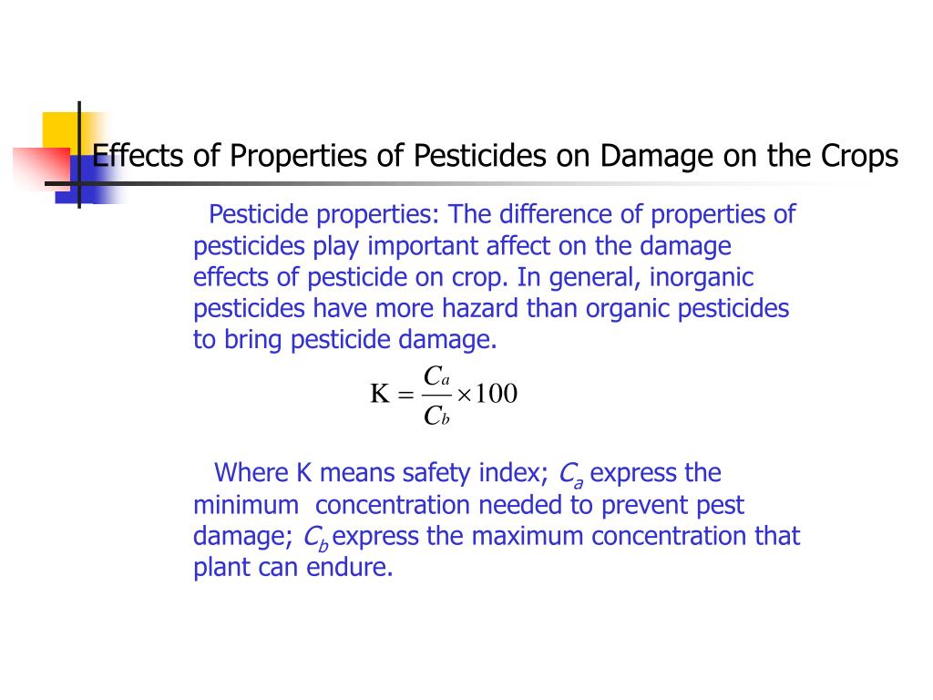 Effects of Properties of Pesticides on Damage on the Crops Pesticide properties: The difference of properties of pesticides play important affect on the damage effects of pesticide on crop. In general, inorganic pesticides have more hazard than organic pesticides to bring pesticide damage. Where K means safety index; Ca express the minimum concentration needed to prevent pest damage; Cb express the maximum concentration that plant can endure.