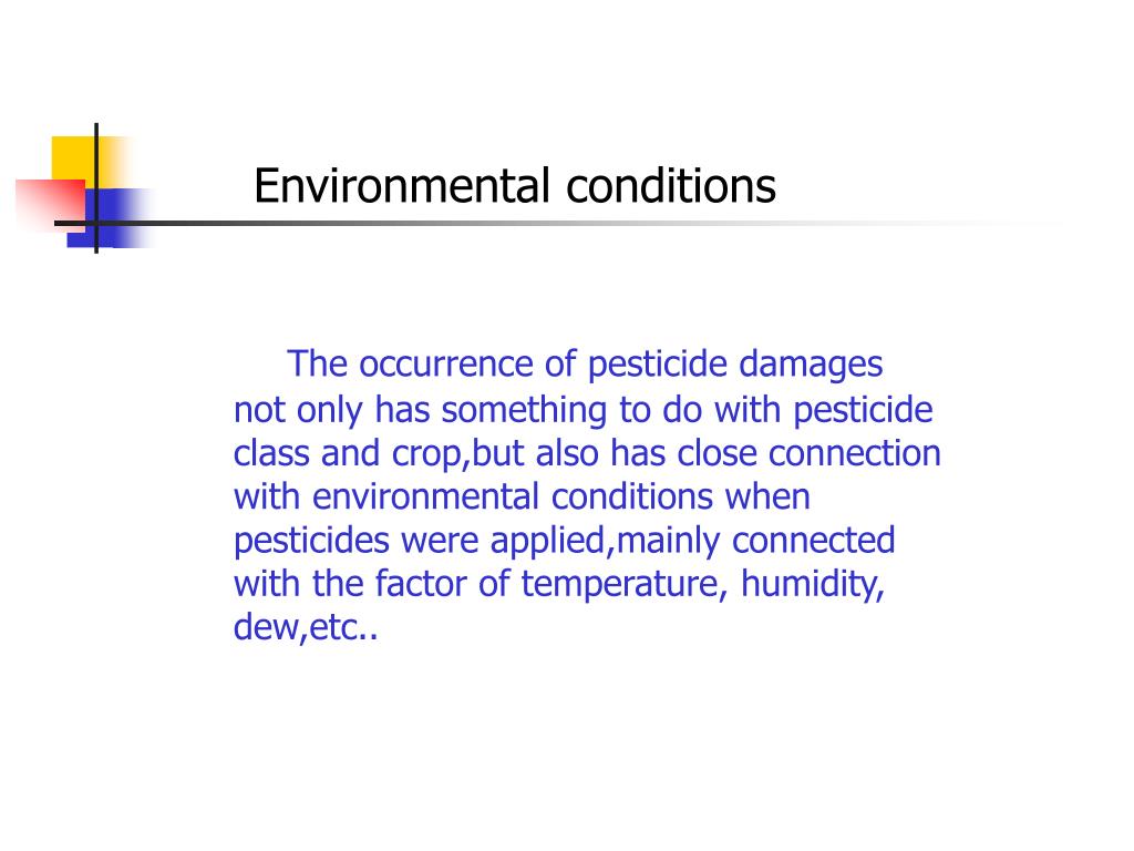 Environmental conditions The occurrence of pesticide damages not only has something to do with pesticide class and crop,but also has close connection with environmental conditions when pesticides were applied,mainly connected with the factor of temperature, humidity, dew,etc..
