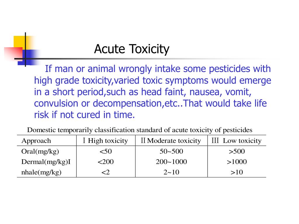 Acute Toxicity If man or animal wrongly intake some pesticides with high grade toxicity,varied toxic symptoms would emerge in a short period,such as head faint, nausea, vomit, convulsion or decompensation,etc..That would take life risk if not cured in time.