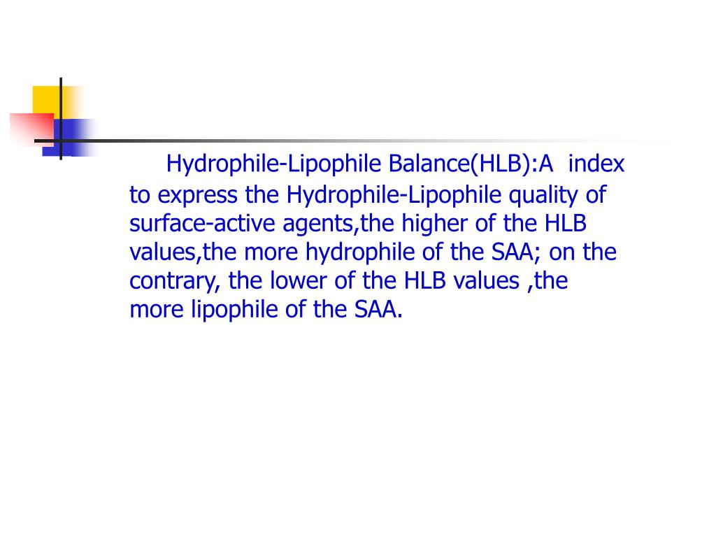 Hydrophile-Lipophile Balance(HLB):A index to express the Hydrophile-Lipophile quality of surface-active agents,the higher of the HLB values,the more hydrophile of the SAA; on the contrary, the lower of the HLB values ,the more lipophile of the SAA.