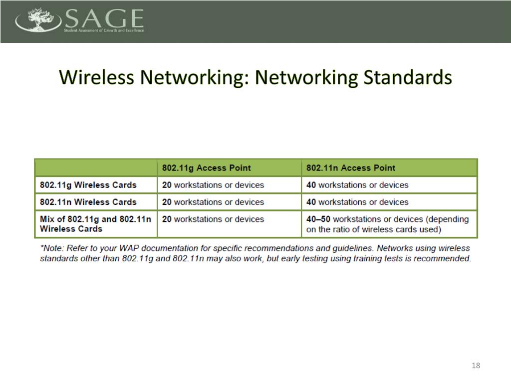 Wireless Networking • Wireless Security • Due to the sensitivity of test-related data, the use of WPA2/AES data encryption is highly recommended. • Using encryption/decryption might slightly decrease overall network speed. • A properly configured wireless network should provide adequate bandwidth for testing applications: • 802.11n is the fastest and most recent IEEE wireless standard, with a throughput of up to 300 megabits per second. • 802.11g has a theoretical throughput of up to 54 megabits per second. • 802.11b has a theoretical throughput of 11 megabits per second. • Ratio of wireless systems to wireless access points (WAPs) of no more than 20:1.
