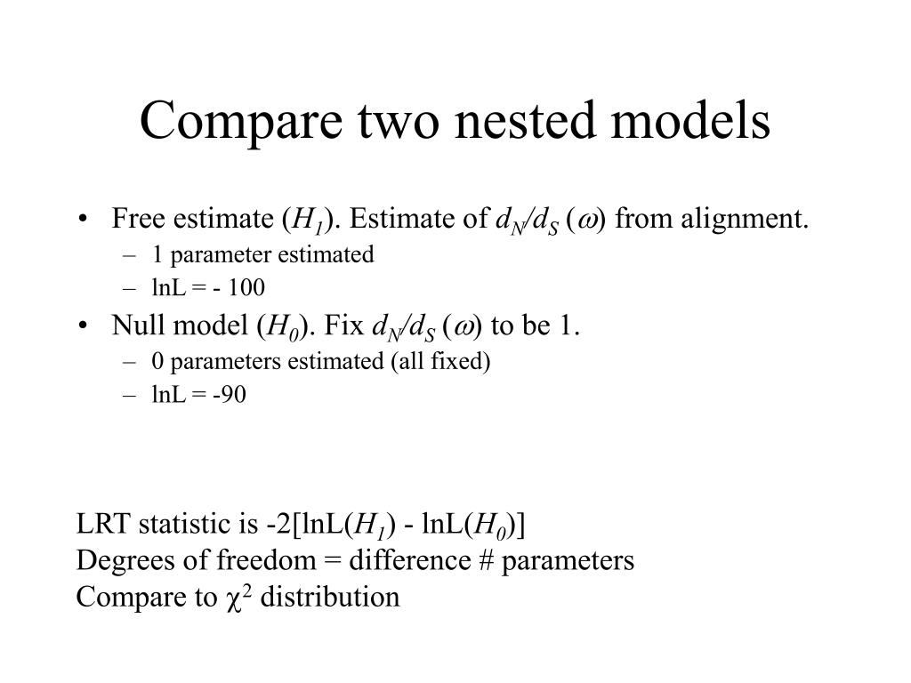 Compare two nested models • Free estimate (H1). Estimate of dN/dS () from alignment. • 1 parameter estimated • lnL = - 100 • Null model (H0). Fix dN/dS () to be 1. • 0 parameters estimated (all fixed) • lnL = -90 LRT statistic is -2[lnL(H1) - lnL(H0)] Degrees of freedom = difference # parameters Compare to 2 distribution