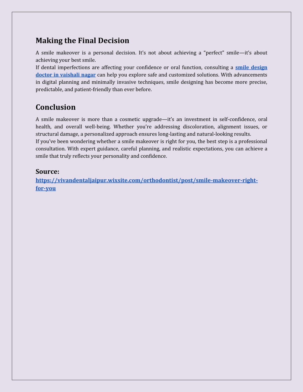 Making the Final Decision A smile makeover is a personal decision. It’s not about achieving a “perfect” smile—it’s about achieving your best smile. If dental imperfections are affecting your confidence or oral function, consulting a smile design doctor in vaishali nagar can help you explore safe and customized solutions. With advancements in digital planning and minimally invasive techniques, smile designing has become more precise, predictable, and patient-friendly than ever before. Conclusion A smile makeover is more than a cosmetic upgrade—it’s an investment in self-confidence, oral health, and overall well-being. Whether you’re addressing discoloration, alignment issues, or structural damage, a personalized approach ensures long-lasting and natural-looking results. If you’ve been wondering whether a smile makeover is right for you, the best step is a professional consultation. With expert guidance, careful planning, and realistic expectations, you can achieve a smile that truly reflects your personality and confidence. Source: https://vivandentaljaipur.wixsite.com/orthodontist/post/smile-makeover-right- for-you