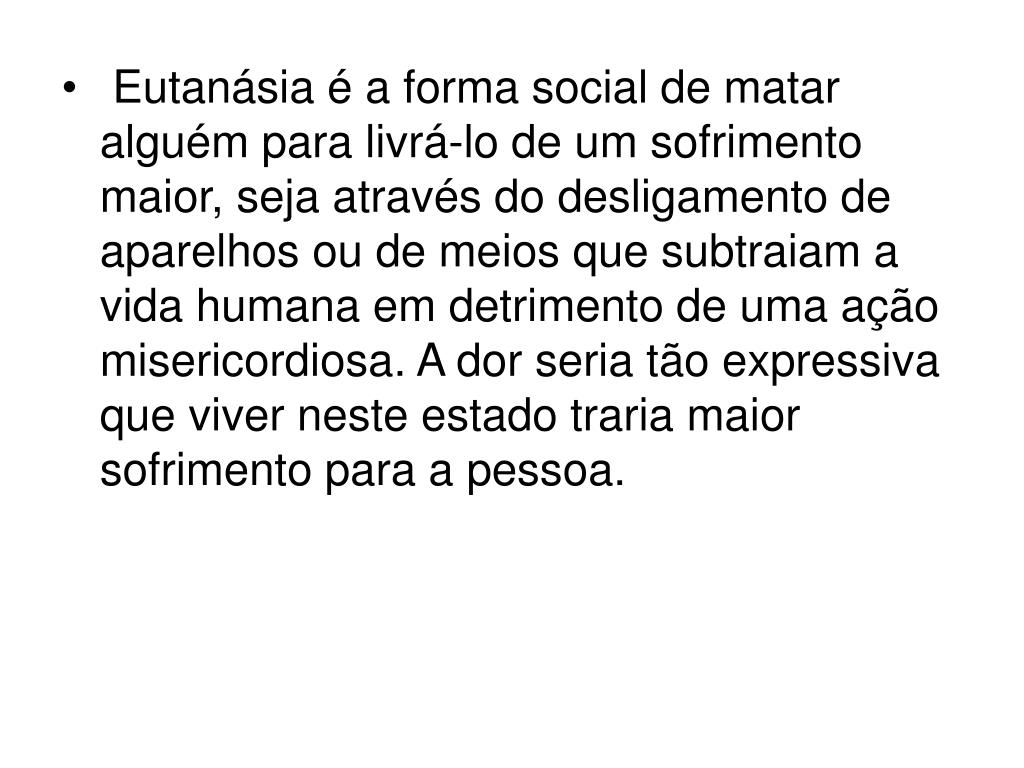 2. Eutanásia é a forma social de matar alguém para livrá-lo de um sofrimento maior, seja através do desligamento de aparelhos ou de meios que subtraiam a vida humana em detrimento de uma ação misericordiosa. A dor seria tão expressiva que viver neste estado traria maior sofrimento para a pessoa.