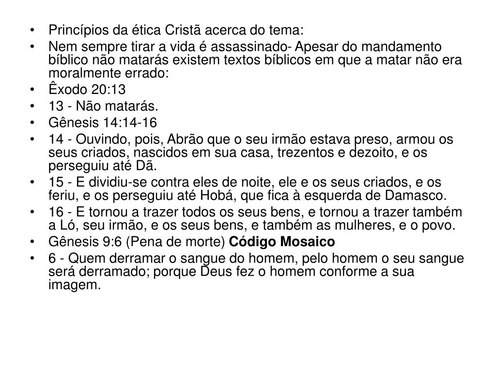 3. Princípios da ética Cristã acerca do tema: • Nem sempre tirar a vida é assassinado- Apesar do mandamento bíblico não matarás existem textos bíblicos em que a matar não era moralmente errado: • Êxodo 20:13 • 13 - Não matarás. • Gênesis 14:14-16 • 14 - Ouvindo, pois, Abrão que o seu irmão estava preso, armou os seus criados, nascidos em sua casa, trezentos e dezoito, e os perseguiu até Dã. • 15 - E dividiu-se contra eles de noite, ele e os seus criados, e os feriu, e os perseguiu até Hobá, que fica à esquerda de Damasco. • 16 - E tornou a trazer todos os seus bens, e tornou a trazer também a Ló, seu irmão, e os seus bens, e também as mulheres, e o povo. • Gênesis 9:6 (Pena de morte) Código Mosaico • 6 - Quem derramar o sangue do homem, pelo homem o seu sangue será derramado; porque Deus fez o homem conforme a sua imagem.
