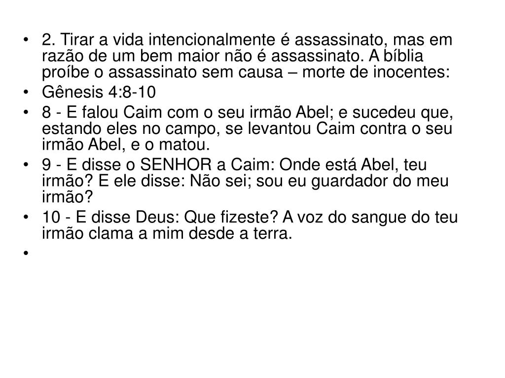 4. 2. Tirar a vida intencionalmente é assassinato, mas em razão de um bem maior não é assassinato. A bíblia proíbe o assassinato sem causa – morte de inocentes: • Gênesis 4:8-10 • 8 - E falou Caim com o seu irmão Abel; e sucedeu que, estando eles no campo, se levantou Caim contra o seu irmão Abel, e o matou. • 9 - E disse o SENHOR a Caim: Onde está Abel, teu irmão? E ele disse: Não sei; sou eu guardador do meu irmão? • 10 - E disse Deus: Que fizeste? A voz do sangue do teu irmão clama a mim desde a terra.