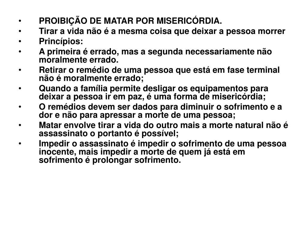 6. PROIBIÇÃO DE MATAR POR MISERICÓRDIA. • Tirar a vida não é a mesma coisa que deixar a pessoa morrer • Princípios: • A primeira é errado, mas a segunda necessariamente não moralmente errado. • Retirar o remédio de uma pessoa que está em fase terminal não é moralmente errado; • Quando a família permite desligar os equipamentos para deixar a pessoa ir em paz, é uma forma de misericórdia; • O remédios devem ser dados para diminuir o sofrimento e a dor e não para apressar a morte de uma pessoa; • Matar envolve tirar a vida do outro mais a morte natural não é assassinato o portanto é possível; • Impedir o assassinato é impedir o sofrimento de uma pessoa inocente, mais impedir a morte de quem já está em sofrimento é prolongar sofrimento.