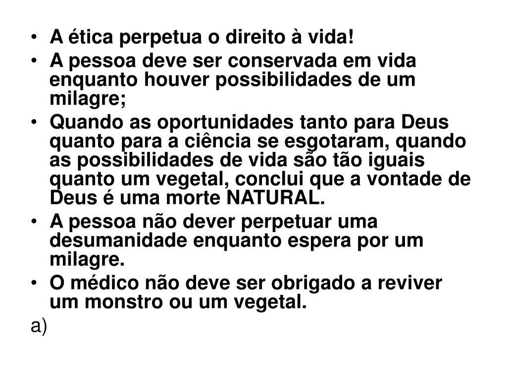 7. A ética perpetua o direito à vida! • A pessoa deve ser conservada em vida enquanto houver possibilidades de um milagre; • Quando as oportunidades tanto para Deus quanto para a ciência se esgotaram, quando as possibilidades de vida são tão iguais quanto um vegetal, conclui que a vontade de Deus é uma morte NATURAL. • A pessoa não dever perpetuar uma desumanidade enquanto espera por um milagre. • O médico não deve ser obrigado a reviver um monstro ou um vegetal.