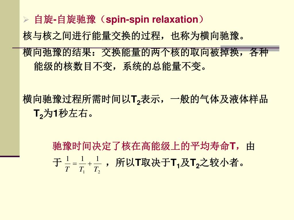 自旋-自旋驰豫(spin-spin relaxation) 核与核之间进行能量交换的过程,也称为横向驰豫。 横向弛豫的结果:交换能量的两个核的取向被掉换,各种能级的核数目不变,系统的总能量不变。 横向驰豫过程所需时间以T2表示,一般的气体及液体样品T2为1秒左右。 驰豫时间决定了核在高能级上的平均寿命T,由 于 ,所以T取决于T1及T2之较小者。