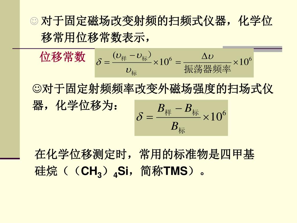对于固定磁场改变射频的扫频式仪器,化学位移常用位移常数表示,对于固定磁场改变射频的扫频式仪器,化学位移常用位移常数表示, 位移常数 • 对于固定射频频率改变外磁场强度的扫场式仪器,化学位移为: 在化学位移测定时,常用的标准物是四甲基硅烷((CH3)4Si,简称TMS)。