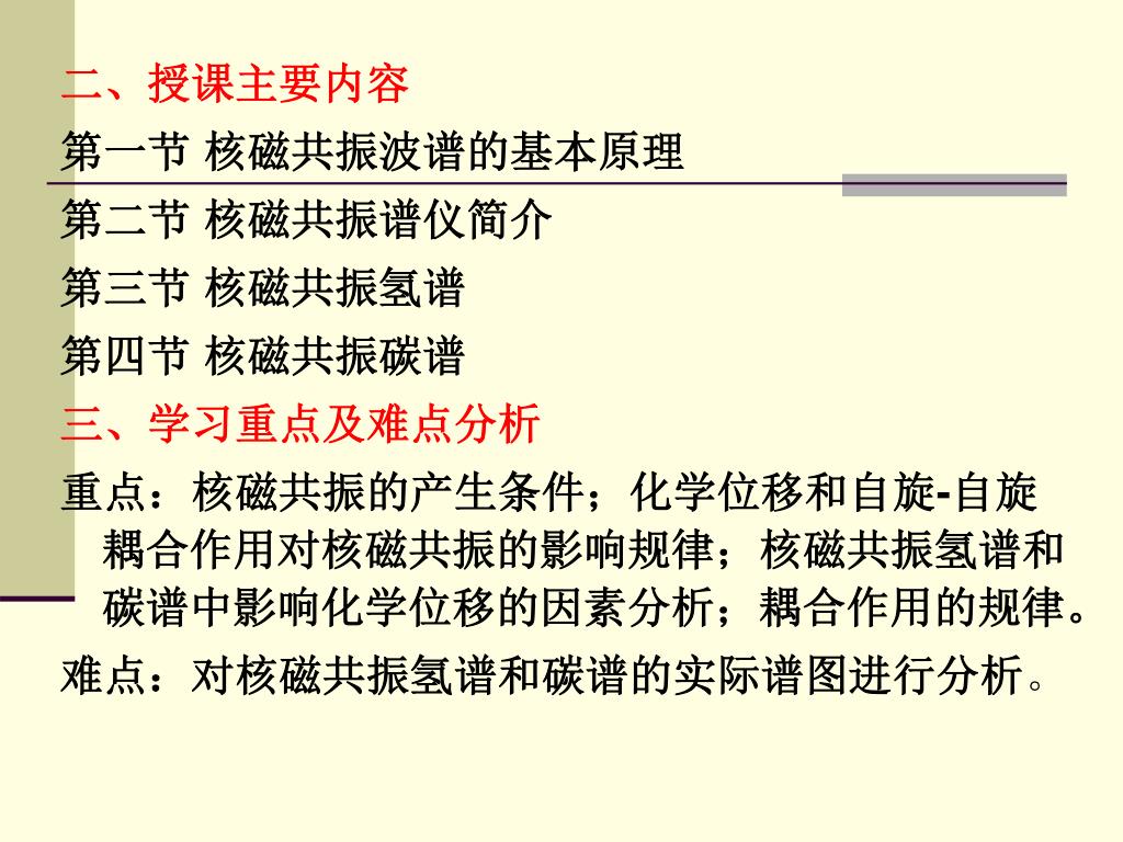 二、授课主要内容 第一节 核磁共振波谱的基本原理 第二节 核磁共振谱仪简介 第三节 核磁共振氢谱 第四节 核磁共振碳谱 三、学习重点及难点分析 重点:核磁共振的产生条件;化学位移和自旋-自旋耦合作用对核磁共振的影响规律;核磁共振氢谱和碳谱中影响化学位移的因素分析;耦合作用的规律。 难点:对核磁共振氢谱和碳谱的实际谱图进行分析。