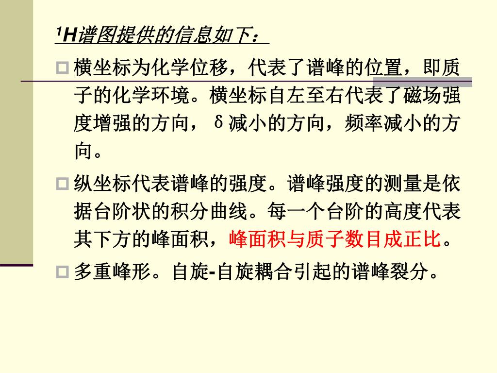 1H谱图提供的信息如下: • 横坐标为化学位移,代表了谱峰的位置,即质子的化学环境。横坐标自左至右代表了磁场强度增强的方向,δ减小的方向,频率减小的方向。 • 纵坐标代表谱峰的强度。谱峰强度的测量是依据台阶状的积分曲线。每一个台阶的高度代表其下方的峰面积,峰面积与质子数目成正比。 • 多重峰形。自旋-自旋耦合引起的谱峰裂分。