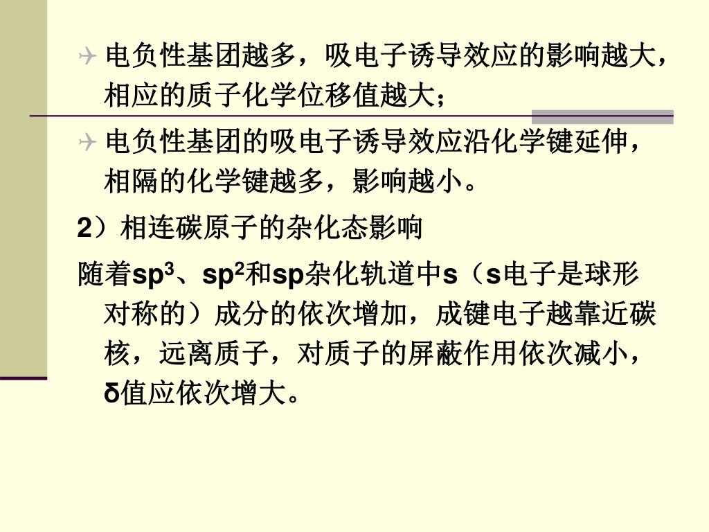 电负性基团越多,吸电子诱导效应的影响越大,相应的质子化学位移值越大;电负性基团越多,吸电子诱导效应的影响越大,相应的质子化学位移值越大; • 电负性基团的吸电子诱导效应沿化学键延伸,相隔的化学键越多,影响越小。 2)相连碳原子的杂化态影响 随着sp3、sp2和sp杂化轨道中s(s电子是球形对称的)成分的依次增加,成键电子越靠近碳核,远离质子,对质子的屏蔽作用依次减小,δ值应依次增大。
