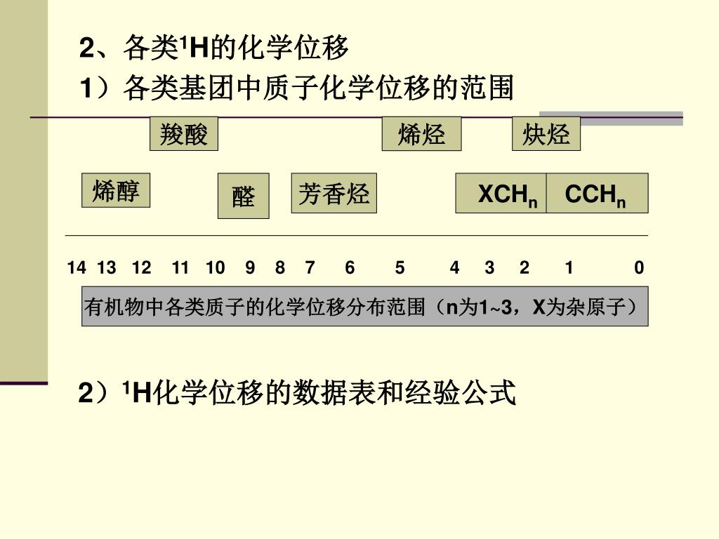 羧酸 烯烃 炔烃 2、各类1H的化学位移 1)各类基团中质子化学位移的范围 烯醇 醛 芳香烃 XCHn CCHn 14 13 12 11 10 9 8 7 6 5 4 3 2 1 0 有机物中各类质子的化学位移分布范围(n为1~3,X为杂原子) 2)1H化学位移的数据表和经验公式