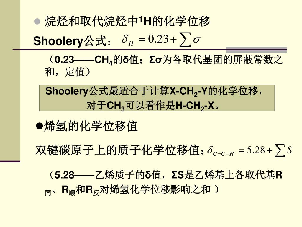 (0.23——CH4的δ值;Σσ为各取代基团的屏蔽常数之和,定值)(0.23——CH4的δ值;Σσ为各取代基团的屏蔽常数之和,定值) • 烷烃和取代烷烃中1H的化学位移 Shoolery公式: Shoolery公式最适合于计算X-CH2-Y的化学位移, 对于CH3可以看作是H-CH2-X。 • 烯氢的化学位移值 双键碳原子上的质子化学位移值: (5.28——乙烯质子的δ值,ΣS是乙烯基上各取代基R同、R顺和R反对烯氢化学位移影响之和 )