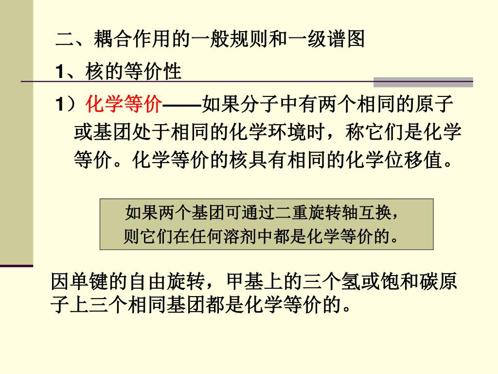 二、耦合作用的一般规则和一级谱图 1、核的等价性 1)化学等价——如果分子中有两个相同的原子或基团处于相同的化学环境时,称它们是化学等价。化学等价的核具有相同的化学位移值。 如果两个基团可通过二重旋转轴互换, 则它们在任何溶剂中都是化学等价的。 因单键的自由旋转,甲基上的三个氢或饱和碳原子上三个相同基团都是化学等价的。