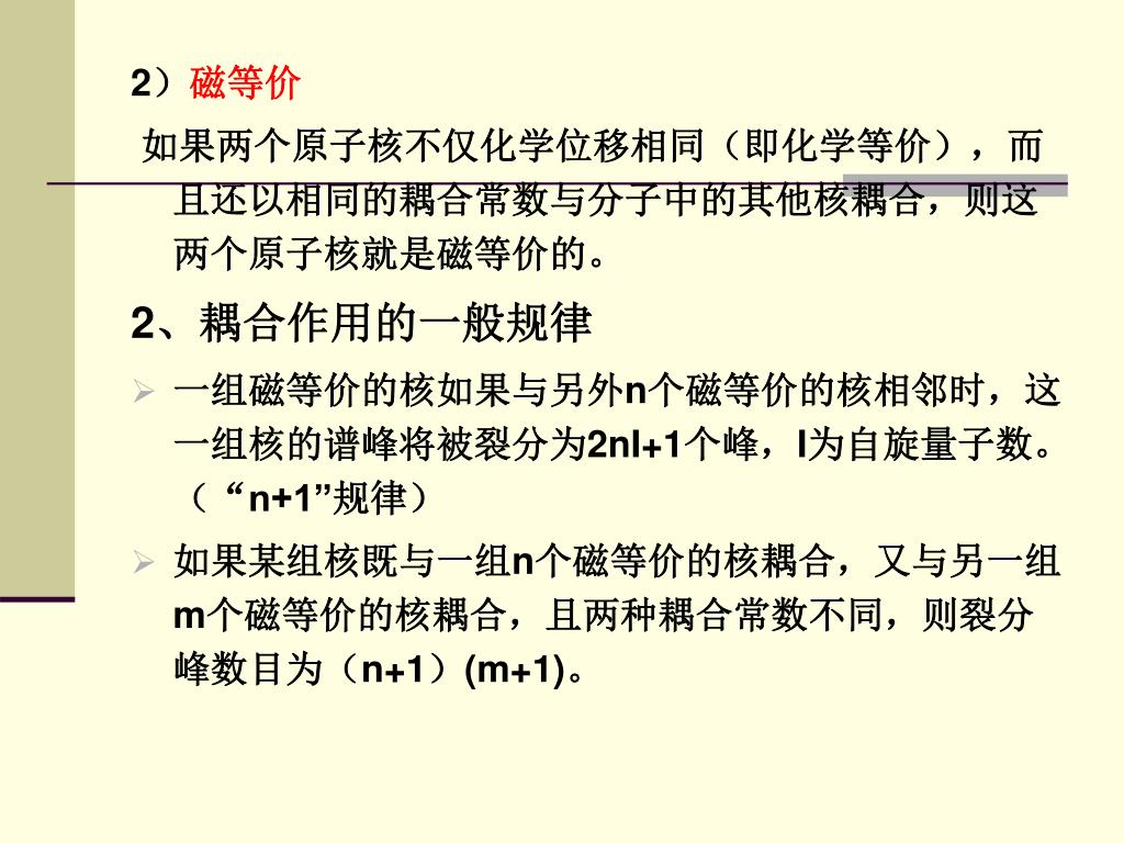 2)磁等价 如果两个原子核不仅化学位移相同(即化学等价),而且还以相同的耦合常数与分子中的其他核耦合,则这两个原子核就是磁等价的。 2、耦合作用的一般规律 • 一组磁等价的核如果与另外n个磁等价的核相邻时,这一组核的谱峰将被裂分为2nI+1个峰,I为自旋量子数。 (“n+1”规律) • 如果某组核既与一组n个磁等价的核耦合,又与另一组m个磁等价的核耦合,且两种耦合常数不同,则裂分峰数目为(n+1)(m+1)。