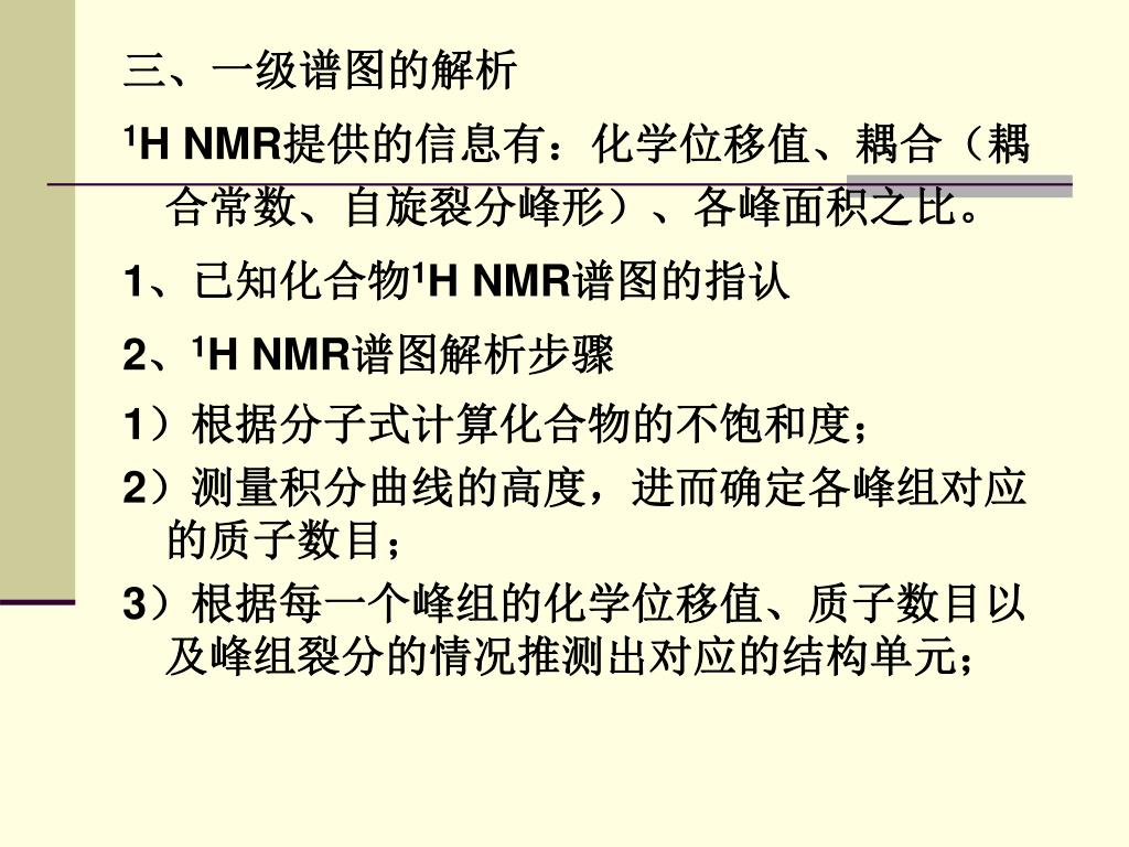 三、一级谱图的解析 1H NMR提供的信息有:化学位移值、耦合(耦合常数、自旋裂分峰形)、各峰面积之比。 1、已知化合物1H NMR谱图的指认 2、1H NMR谱图解析步骤 1)根据分子式计算化合物的不饱和度; 2)测量积分曲线的高度,进而确定各峰组对应的质子数目; 3)根据每一个峰组的化学位移值、质子数目以及峰组裂分的情况推测出对应的结构单元;