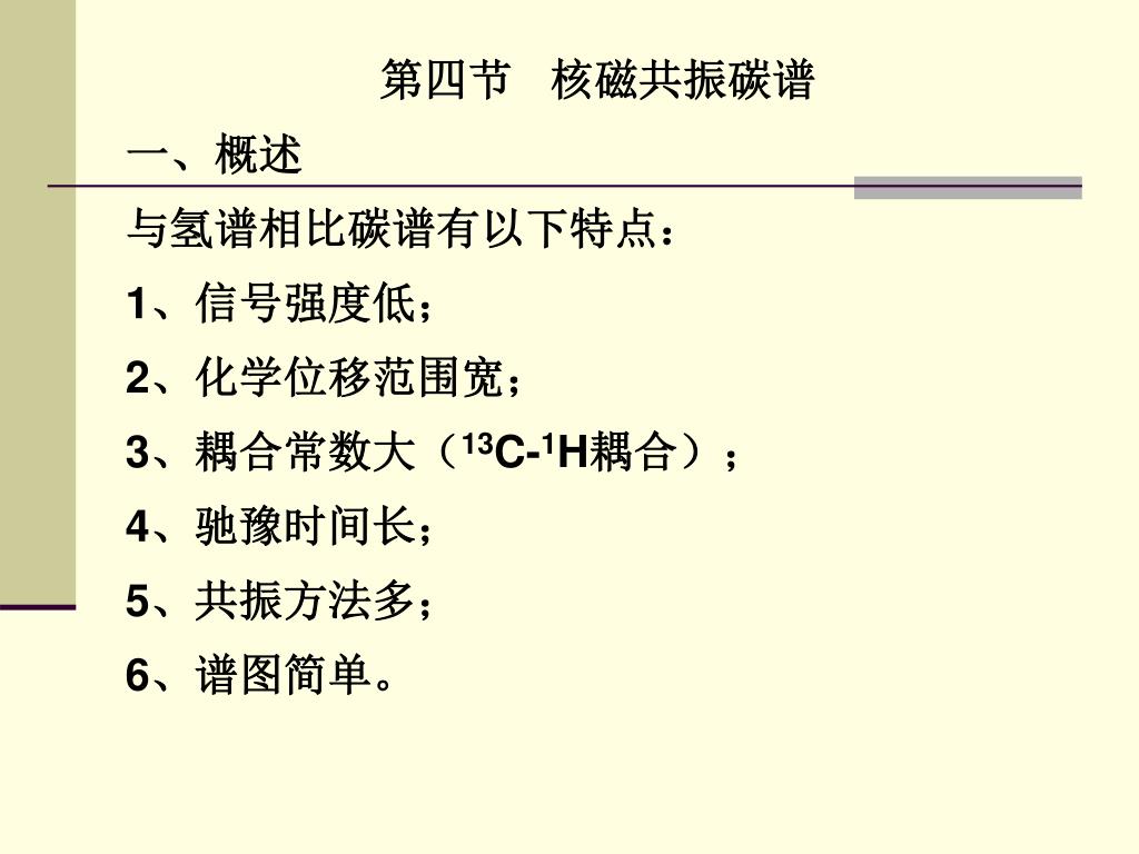 第四节 核磁共振碳谱 一、概述 与氢谱相比碳谱有以下特点: 1、信号强度低; 2、化学位移范围宽; 3、耦合常数大(13C-1H耦合); 4、驰豫时间长; 5、共振方法多; 6、谱图简单。