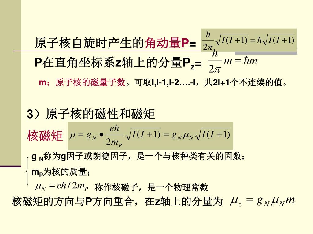 P在直角坐标系z轴上的分量Pz= 原子核自旋时产生的角动量P= m:原子核的磁量子数。可取I,I-1,I-2….-I,共2I+1个不连续的值。 3)原子核的磁性和磁矩 核磁矩 g N称为g因子或朗德因子,是一个与核种类有关的因数; mP为核的质量; 称作核磁子,是一个物理常数 核磁矩的方向与P方向重合,在z轴上的分量为