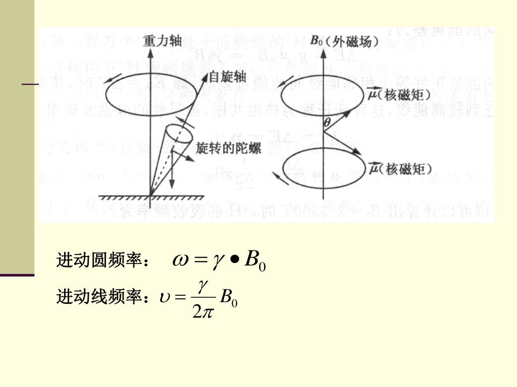 磁旋比 4)原子核的磁旋比 是原子核的基本属性之一,核的磁旋比越大,核的磁性越强。 2、磁性核在外磁场(B0)中的行为 1)原子核的进动 当磁核处于一个均匀的外磁场B0中,核因受到B0产生的磁场力作用围绕着外磁场方向作旋转运动,同时仍然保持本身的自旋。这种运动方式称为进动或拉摩进动。