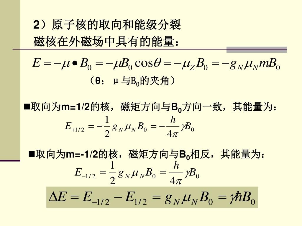 2)原子核的取向和能级分裂 磁核在外磁场中具有的能量: (θ:μ与B0的夹角) • 取向为m=1/2的核,磁矩方向与B0方向一致,其能量为: • 取向为m=-1/2的核,磁矩方向与B0相反,其能量为: