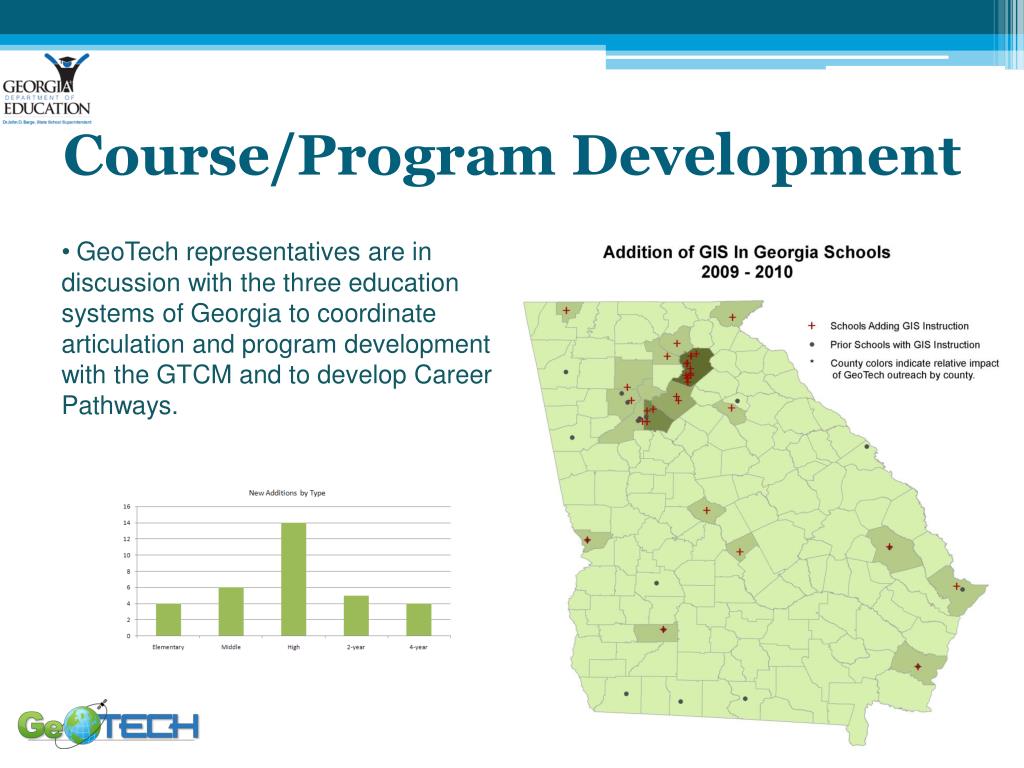 Course/Program Development • GeoTech representatives are in discussion with the three education systems of Georgia to coordinate articulation and program development with the GTCM and to develop Career Pathways.